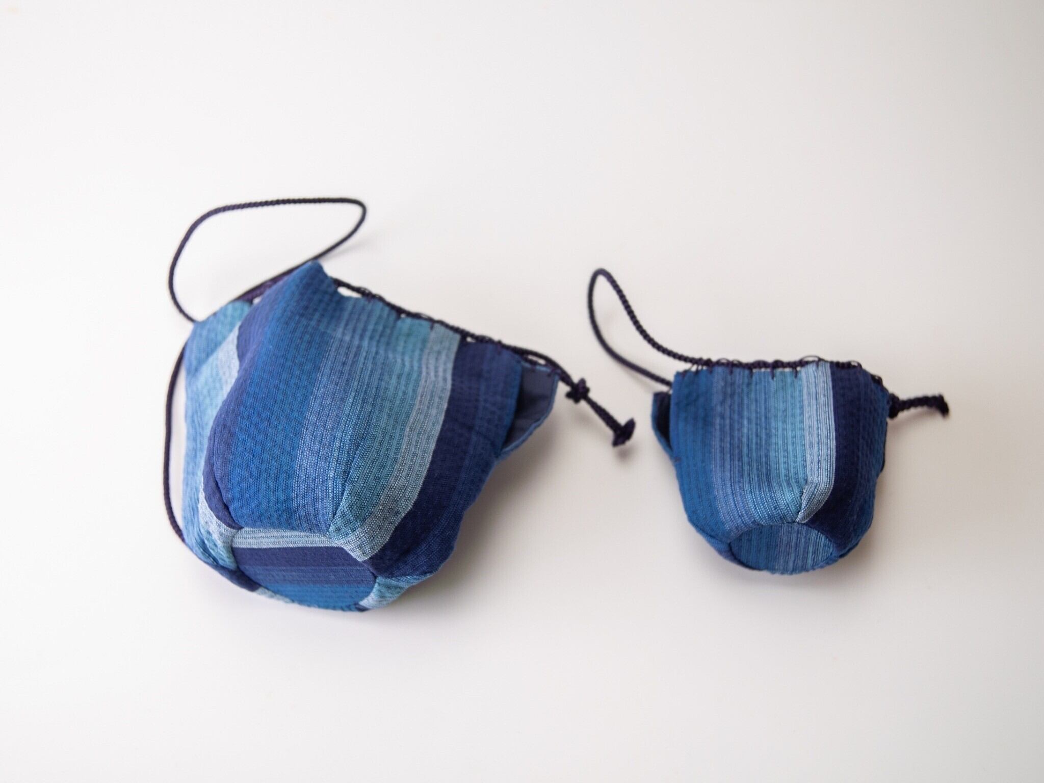 徳島県特産の杉材を使用しています。正絹の帯地を藍染したものを独特のぼかしのようなむら染めをして仕上げており、杉材は丁寧に藍染したものを作家の感性によるエイジング加工が施され、まるで水の流れのような柔らかな印象を与えます。自然の美しさを感じさせる模様は、一つ一つ異なり、まさに唯一無二の逸品です。