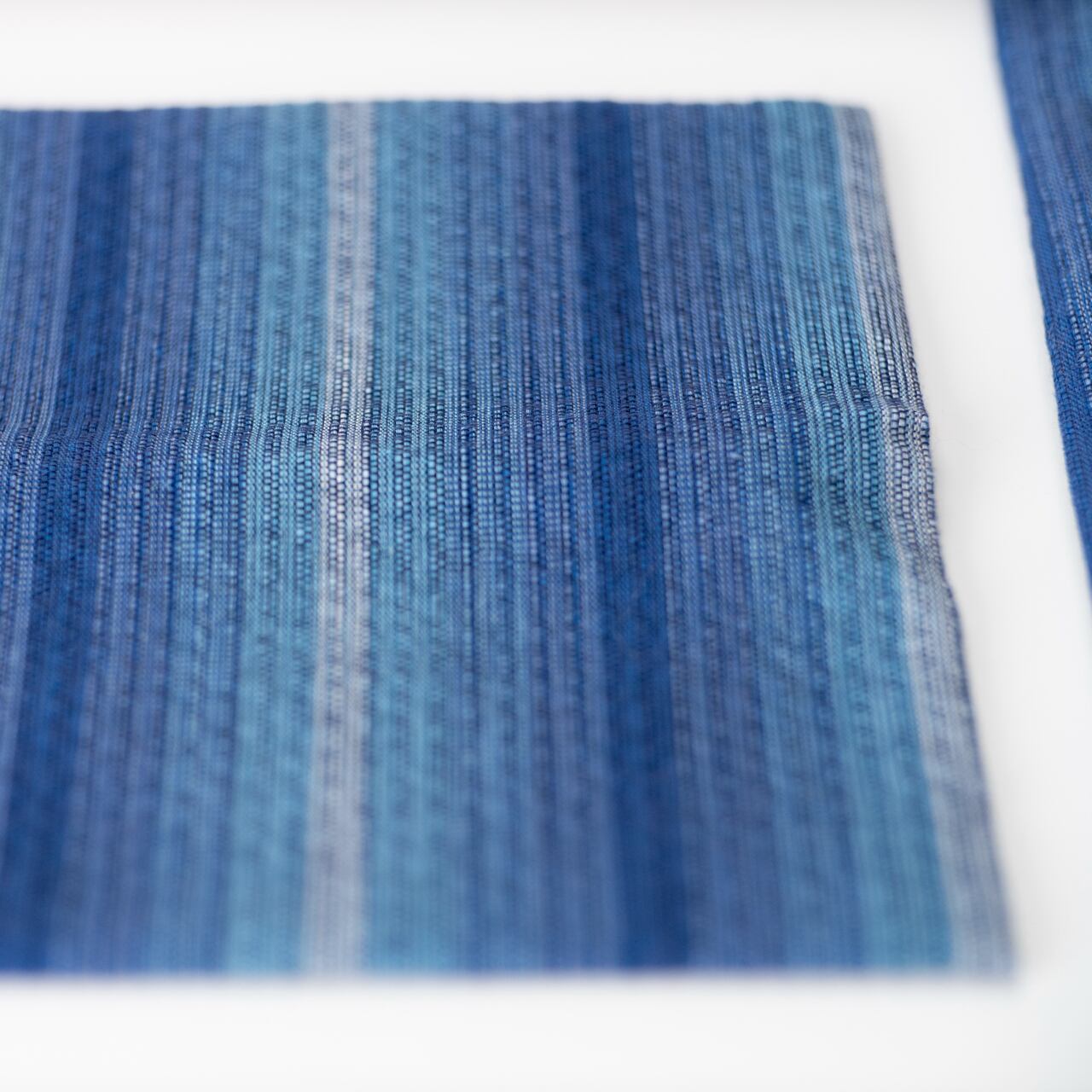 「吉野川」は、藍染を施した後にわざとエイジング加工を施しました。この加工が小波のように見えるため、「吉野川」と名付けました。徳島の誇る大河の自然と風土を感じさせる逸品です。手仕事のため、一つ一つの模様が異なる点も魅力のひとつです。伝統的な藍染と現代的な加工技術が融合し、新しい美意識を提案する「吉野川」をお楽しみください。
